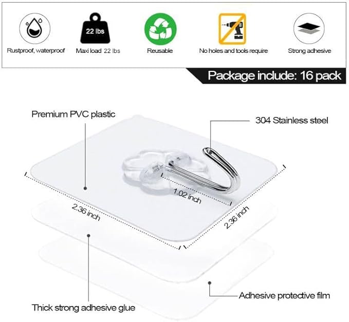 - Stainless Steel Self Adhesive Hooks - RustProof and waterproof adhesive wall hooks: 16 sticky hooks in one pack, the wall hooks for hanging are made of stainless steel and pc material,rustproof,waterproof, oilproof and durable. Adhesive hooks for hanging can be used in living room, kitchen, bathroom shower wall, behind door, outdoor etc.